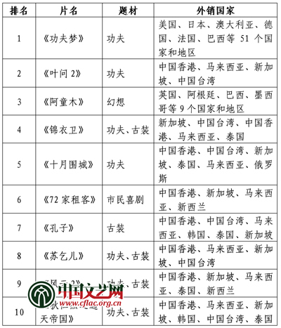 据统计称,2010国产电影海外销售前十名的影片是:《功夫梦》《叶问2》《阿童木》《锦衣卫》《十月围城》《72家租客》《孔子》《苏乞儿》《风云2》和《狄仁杰之通天帝国》(见右表)。