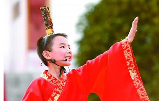 秭归县一名小学生在屈原祠前吟唱屈原作品《橘颂》。郑家裕摄/光明图片