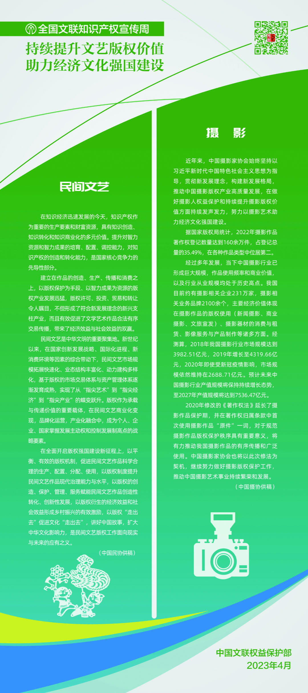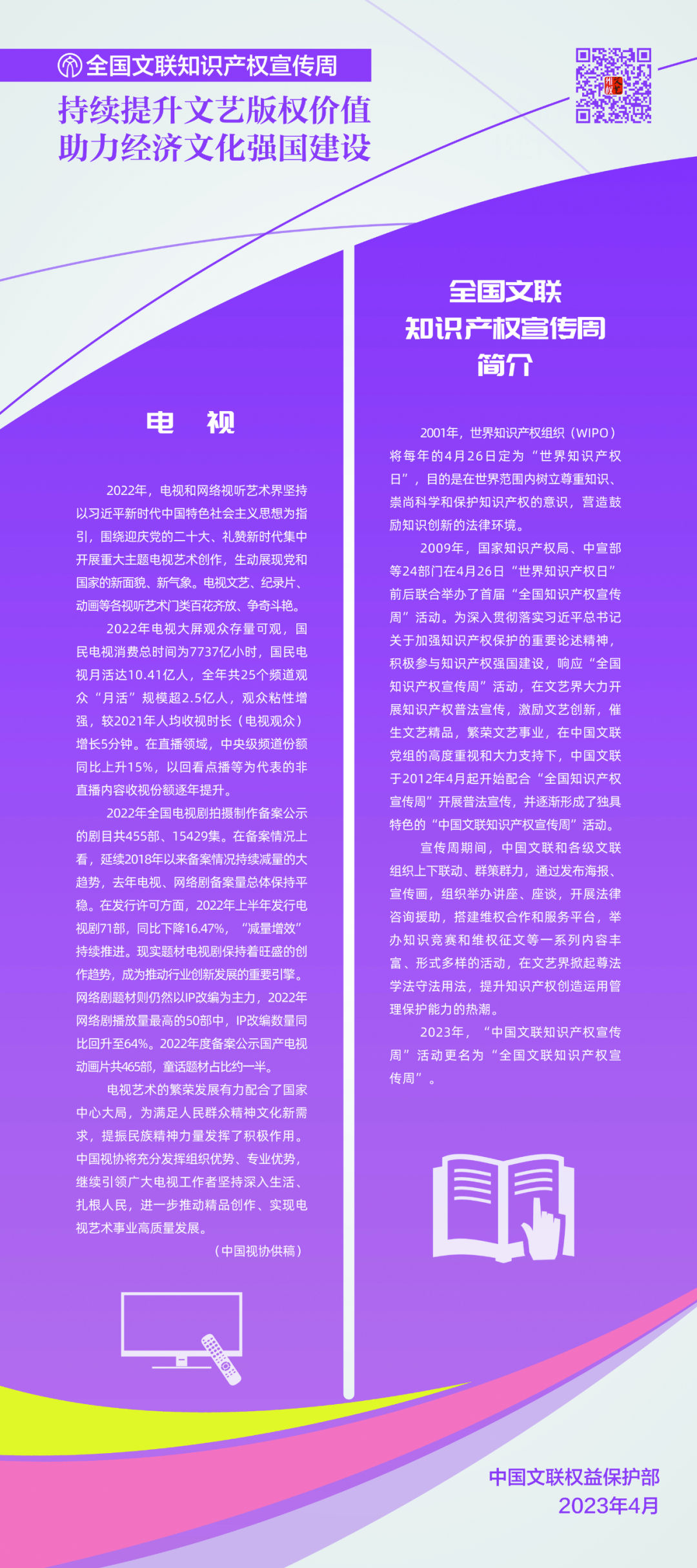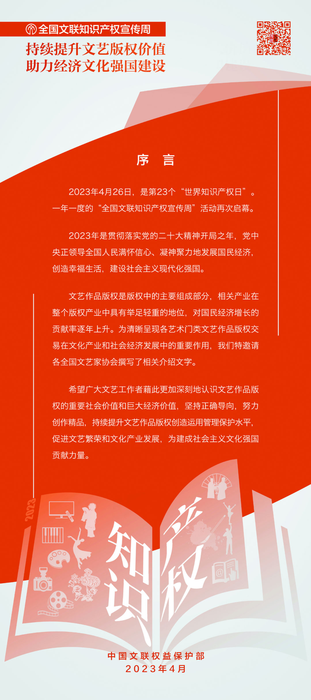在第23个世界知识产权日来临之际,一年一度的“全国文联知识产权宣传周”活动将于2023年4月24日正式启动。为激励广大文艺工作者多出精品力作,深入发掘文艺作品版权的经济社会价值,助力经济、文化强国建设,本年度“全国文联知识产权宣传周”活动的主题定为“持续提升文艺版权价值 助力经济文化强国建设”。中国文联及其团体会员,包括11家全国文艺家协会和各省(区、市)文联组织将同期策划举办一系列知识产权普法宣传活动。