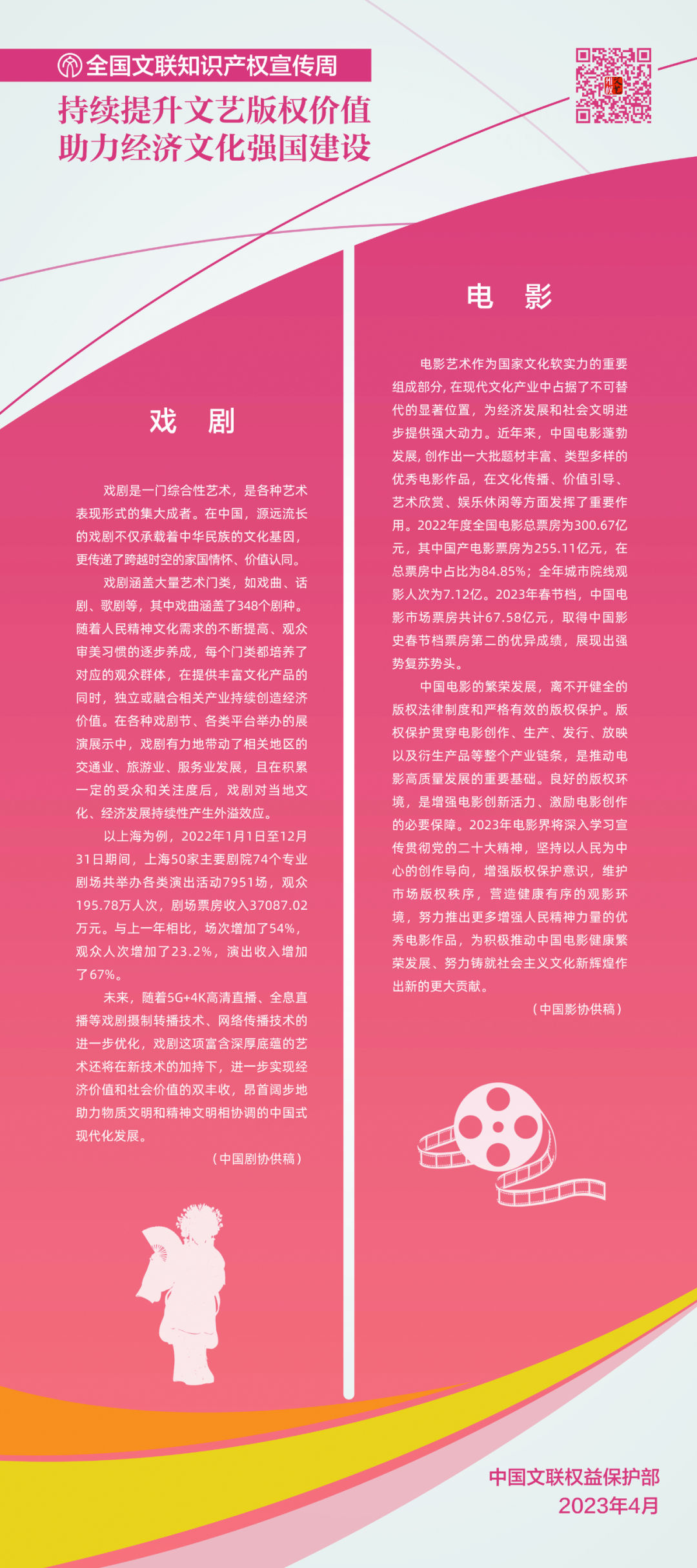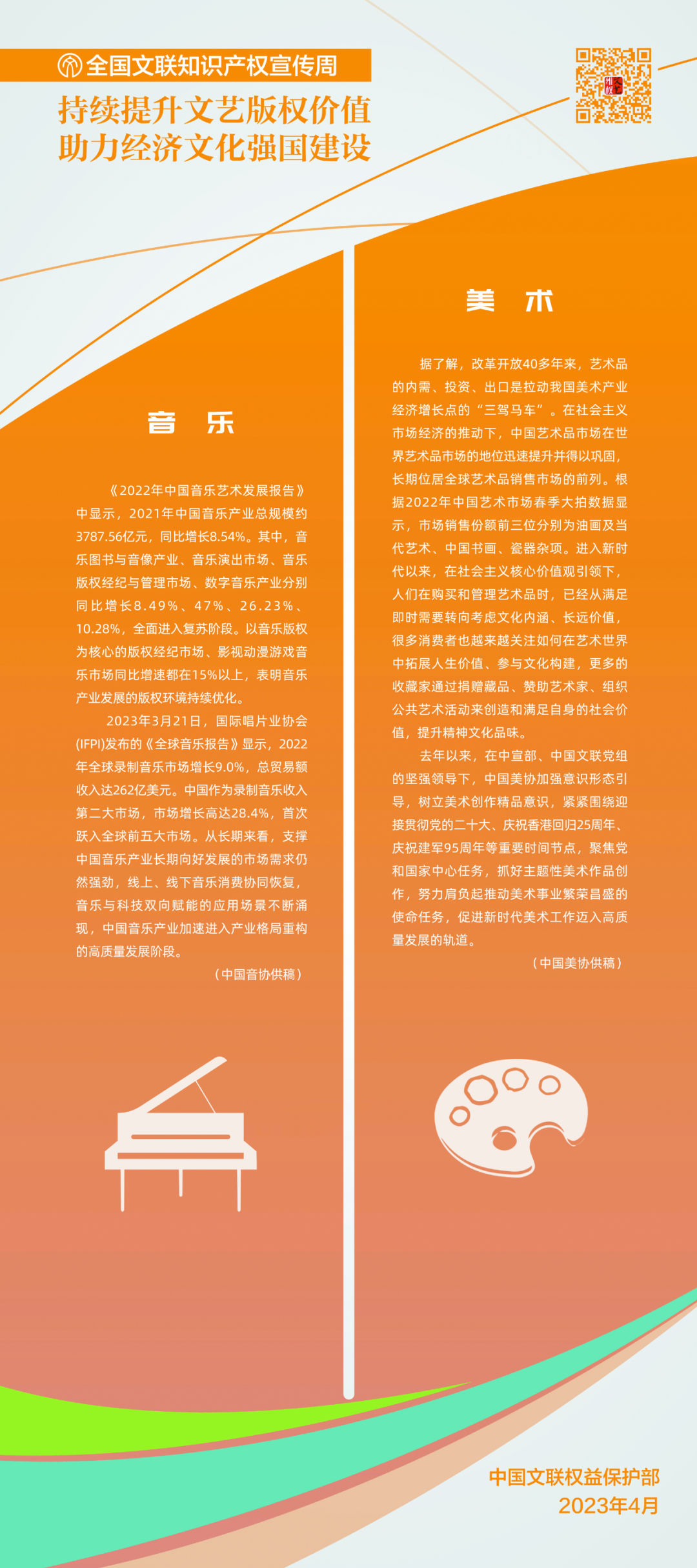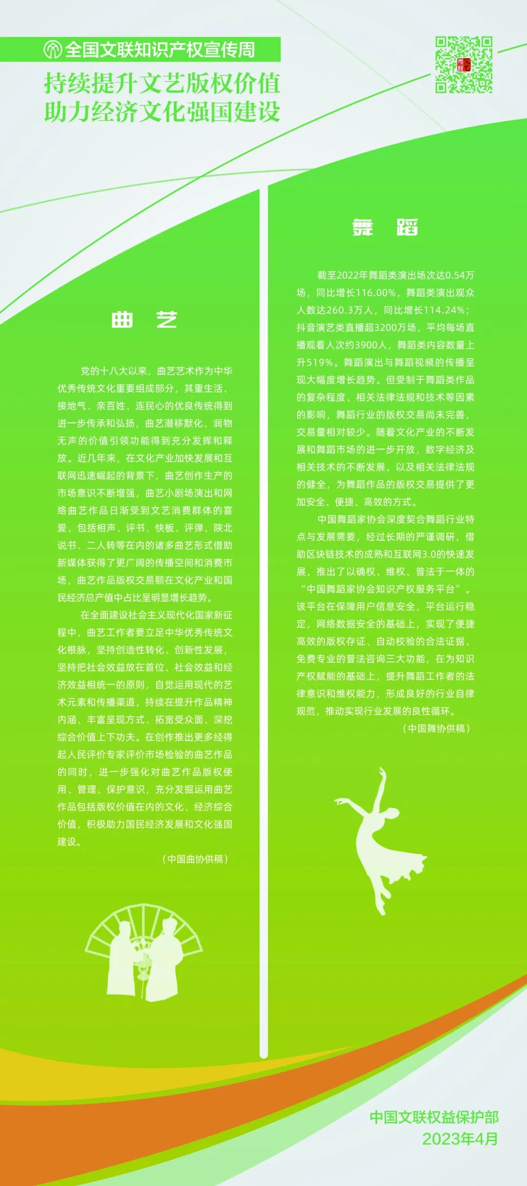 在第23个世界知识产权日来临之际,一年一度的“全国文联知识产权宣传周”活动将于2023年4月24日正式启动。为激励广大文艺工作者多出精品力作,深入发掘文艺作品版权的经济社会价值,助力经济、文化强国建设,本年度“全国文联知识产权宣传周”活动的主题定为“持续提升文艺版权价值 助力经济文化强国建设”。中国文联及其团体会员,包括11家全国文艺家协会和各省(区、市)文联组织将同期策划举办一系列知识产权普法宣传活动。