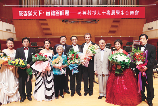 2009年9月4日,由中国音协与凤凰卫视主办的“桃李满天下·音礼答师恩——蒋英教授九十寿辰学生音乐会”在北京音乐厅举行。蒋英的得意门生:章亚伦、祝爱兰、姜咏、赵登营、多吉次仁及吴晓路从世界各地赶回北京登台。图为蒋英、嘉宾与学生们在一起