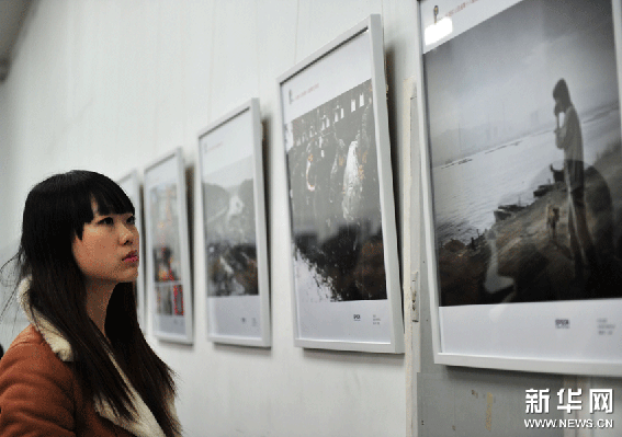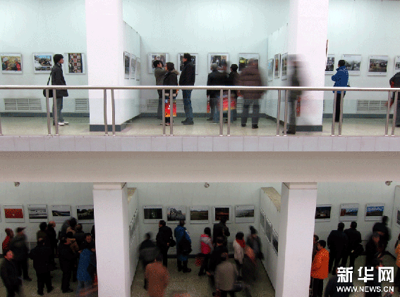 1月8日,参观者在山西省文艺大厦观看摄影作品。