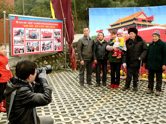 活动中,摄影家们搭起了天安门的背景布,为村民们拍摄全家福照片,并现场打印出来赠送给村民。董泽洲、田方夫妇和全家人拍完照后,又请摄影家为他们两人单独拍一张。他们说,结婚9年了,但从来没有拍过结婚照,今天终于弥补了这个遗憾。还在读小学的王霞、贾益雷围着摄影家万雁明团团转,亲热地喊着万叔叔,拉着他为她们拍照。当摄影家李燊为80多岁的易盛芳老人特地送来上次到棋盘村为其拍摄的照片时,老人的眼睛湿润了。这样的真情流露也让李燊感动得说不出话来,此时千言万语已化作无言的相望。