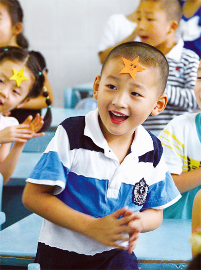 2010年9月1日,恢复健康后的郎铮在小学的课堂上拍手欢唱着。杨卫华/摄