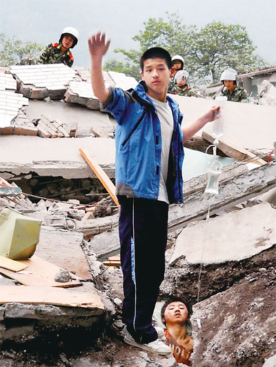 2008年5月13日,靠着同学帮助输液等紧急措施在废墟中扛过了20多个小时的北川中学高一学生廖波被解放军救起。之后,他在绵阳做了左小腿截肢手术。陈燮/摄