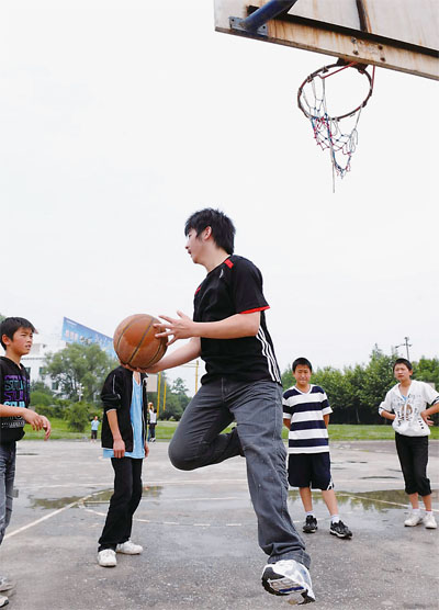 2009年5月5日,截肢后的廖波不久便在北京安装了假肢的廖波打起了篮球。陈燮/摄