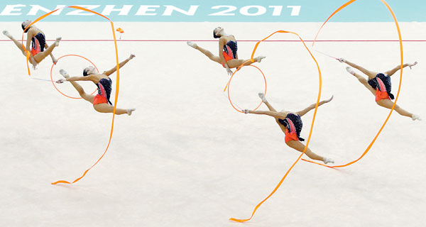 中国队员在艺术体操集体全能3带2圈的比赛中。 新华社记者 陈建力/摄