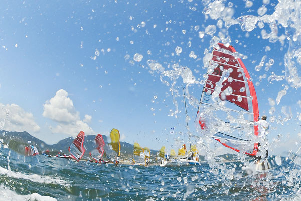 大运会帆船项目比赛现场。参赛选手在比赛区域集结,等待指令。 新华社记者 丁旭/摄