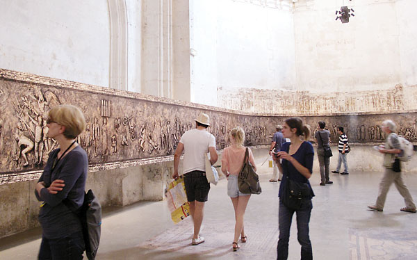 但是可不要小看这座方寸之城。阿尔勒始建于公元46年,被誉为“高卢人的小罗马”,保留了古老的罗马城墙、圆形竞技场,有7座古迹被联合国教科文组织列为世界文化遗产,城中还点缀着众多17世纪、18世纪的典型建筑。自然美景和人文历史背景为摄影师们展现个性提供了丰富的选择。在持续3个月的摄影节期间,60余场展览就“埋伏”在这一座座巴洛克风格的教堂、古罗马时代的废墟、小咖啡馆、艺术书店,甚至民居的酒窖中。当我们参观一位中国摄影师朋友的展览时,穿过曲曲折折的小巷里喝酒谈天的人群,却直接被领进了餐厅。原来展览就利用了餐馆室内的布置,侍者们则殷勤地为参观者添着葡萄酒。