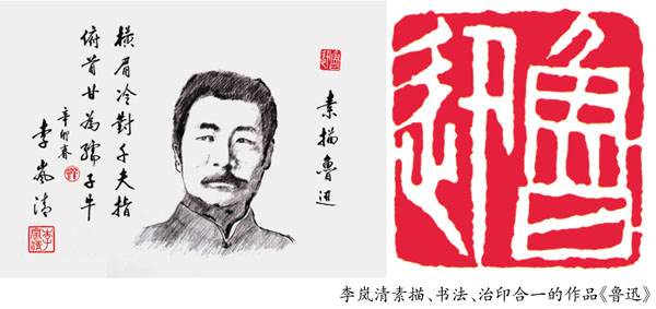 “贿赂”的结果,使得李岚清一方面深入中国印学,追本溯源、研习经典,另一方面,以极大的热情和心力在继承传统的基础上探索创新,从篆刻理念、篆刻内容、技法到表现形式都新意迭出,构筑成宏阔而精深的篆刻大观。“以印铭史”展示了反映改革开放初期重要历史的40多件作品;在“情系神州”中,作者以真挚的情感和深切的情怀表现祖国的山川自然、人文历史和社会发展,从中可以阅读作者当时的心境;“走出国门”中,收入作者应邀在新加坡、俄罗斯和法国举办的“中国印·李岚清篆刻艺术展”而创作的部分作品,其中有“达·芬奇”、“歌德”、“巴尔扎克”、“莎翁”、“雨果”等大量西方文化艺术名人以及与音乐、舞蹈、美术有关的“天鹅湖”、“悲怆”、“芭蕾”等作品。它们以丰富多样的印章形制和篆刻创意,反映了作者对西方文化的深厚学养,用中国的篆刻形式为西方著名文学艺术家和经典作品“造像”,在篆刻创作中还是第一次;展览还展出了作者最新的一组创作“素描大师”,他在宣纸上为自己景仰的李叔同、赵元任、齐白石、徐悲鸿等文化名人画上素描,然后盖上为他们篆刻的印章,再写上为他们写的诗歌,形成了新颖的“诗、书、画、印”为一体的形式。