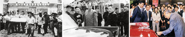 史:1952年,李岚清(抬奠基石者左二)参加中国第一汽车制造厂奠基典礼(上图左);1958年,李岚清(左二)陪同邓小平、彭真等在北京中南海观看中国第一汽车制造厂生产的第一辆轿车(上图中);2007年8月,李岚清参观中国第一汽车制造厂(上图右)——中国汽车工业的建设和发展经历过曲折而漫长的道路,由于改革开放,才走上了快速发展的道路。