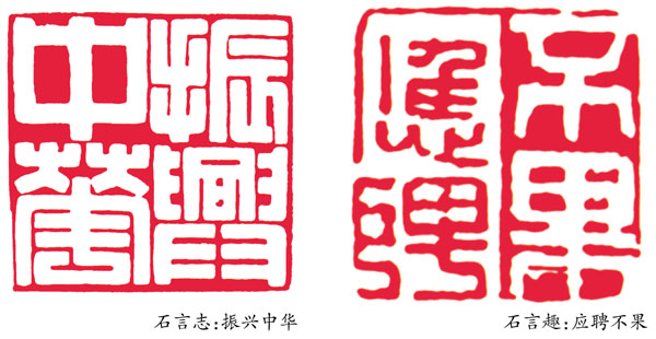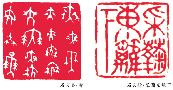 ——“石言美”、“石言志”、“石言情”、“石言趣”、“石言事”。“‘石言美’说的是篆刻艺术的审美追求,篆刻首先要给人以审美之感受,这是篆刻艺术的根本。其他四方印说的是篆刻的内容:‘石言志’是说印可明志,可以表达治印者的理念、价值观、人生观、世界观等;‘石言情’是说印可以表达友情、亲情、心情;‘石言趣’是说印可表达各种情趣,不但有助于治印者自己创造健康乐观的精神世界,亦可与他人分享;‘石言事’是说印可以铭记一些重要事件,见印忆事。”而“石之美”与“石之趣”里,就有生活的小点滴和小幽默。
