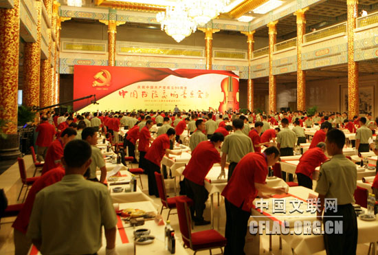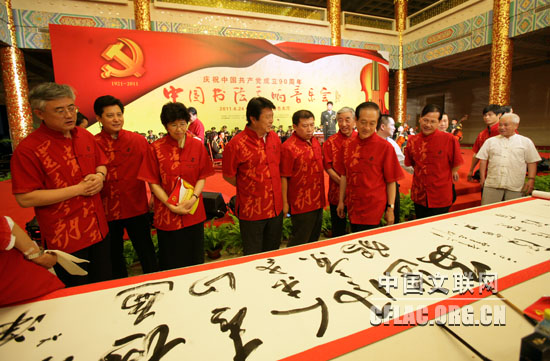 为庆祝中国共产党成立90周年,展示盛世中国的正大、和谐气象,奏响中国书法界、音乐界爱党爱国的时代强音,6月24日,由中国文联、中国书协、人民画报社主办,中国文联演艺中心协办的“纪念中国共产党成立90周年——中国书法交响音乐会”在人民大会堂金色大厅隆重举行。