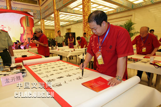6月24日,由中国文联、中国书协、人民画报社主办,中国文联演艺中心协办的“纪念中国共产党成立90周年——中国书法交响音乐会”在人民大会堂金色大厅隆重举行。 图为书法家们现场创作。中国文联网 孟祥宁 摄