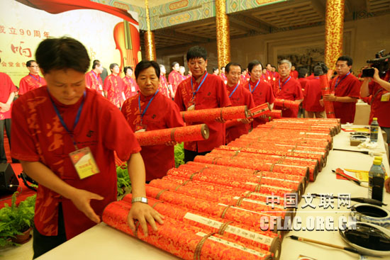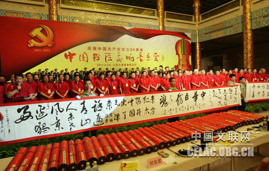 6月24日,由中国文联、中国书协、人民画报社主办,中国文联演艺中心协办的“纪念中国共产党成立90周年——中国书法交响音乐会”在人民大会堂金色大厅隆重举行。 图为书法家们以沉甸甸的作品向党的生日献礼。中国文联网 孟祥宁 摄