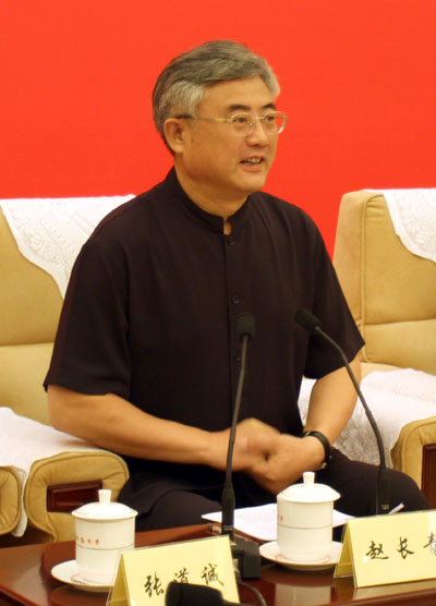 7月30日,“我爱我的祖国——李铎诗词书法展”新闻发布会在全国政协礼堂举行。图为中国书协分党组书记、驻会副主席赵长青代表主办单位致辞。中国文联网 冉茂金 摄
