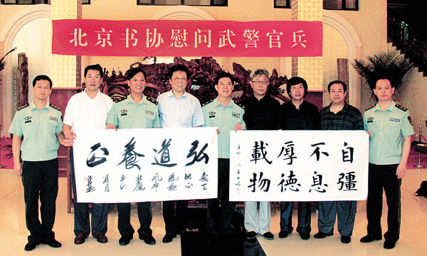 7月29日,“八一”建军节前夕,在中国书协理事、北京书协驻会副主席兼秘书长田伯平的带领下,北京书协慰问团一行6人赴朝阳区孙河郎枣生态园慰问北京武警总队官兵。中国书协理事、北京书协副主席龙开胜、刘俊京、孟繁禧,北京书协理事马俊明等参加此次活动。北京武警总队副政委李金星、北京武警总队干休所政委张业军等出席欢迎仪式。