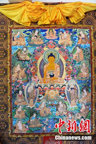 门口一幅较长的画卷,更是精品,画中讲述了释迦摩尼的生平,全卷色彩绚丽大方、构图精细复杂、线条细腻流畅、人物神色各异,让到访的参观者流连忘返,还有记者拿起放大镜仔细端详品味,细节中体现了作者独特艺术风格。