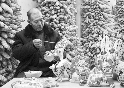 走进胡深家里,小院儿很安静,胡深老人的客房简直就是个小型泥塑作品展览室,炕上摆着被选作生肖邮票的泥塑马、泥塑羊,还有憨态可掬、惹人喜爱的泥塑猪和捏好的小型泥塑制品。此外,房间里还有泥塑生肖挂件和坐狮、坐虎、关羽、钟馗等泥塑作品。有彩绘的也有白描的,彩绘的色彩艳丽,显得热烈红火、气氛浓烈;白描的则显得古朴、秀丽。