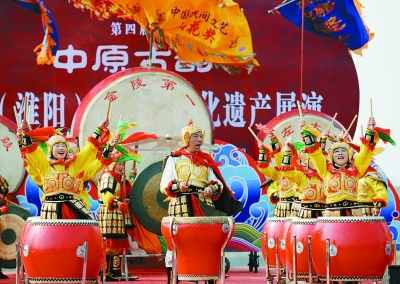 3月13日,第四届中原古韵中国(淮阳)非物质文化遗产展演活动在河南省淮阳县开幕。来自河南、山东、山西、安徽、河北、湖北、江苏、江西、陕西、湖南十省的国家级非物质文化遗产项目竞相登场亮相,为当地群众和游客奉献了一道民俗文化盛宴。图为江苏省留左大鼓表演团在现场表演《普天乐》。 新华社记者 李 博 摄