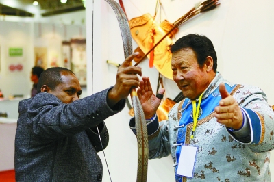 弓箭技艺传承人向外国游客展示技艺。 陈 曦 摄