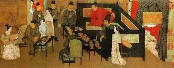 《韩熙载夜宴图》出现的餐桌是宋代最流行的细腿长桌;宋佚名《梧阴清暇图》的梧桐树下、大屏风前,放的是一张黑漆束腰书案,这是主人用来观书、写作的文化用具;旁边还有一张红漆花腿方桌,堆放著杂物。
