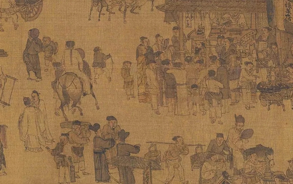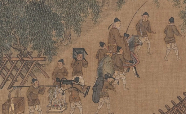 宋由于“程朱理学”的思想禁锢,服饰文化虽承袭唐朝,但风格却不再像唐朝一样奢华,而是简洁质朴。宋代女装拘谨、保守,色彩淡雅恬静,襦衣、褙子的"遮掩"功能加强,一切的"张狂"刹时都收敛了许多。 宋代官吏的服饰有祭服、朝服、公服、便服等。便服主要是一种圆领宽袖或窄袖的衫袍,一般男子及官员都可穿着。隋唐时期的幞头,发展到宋代,已成为男子的主要首服。上自皇帝,下至百官,除祭祀、隆重朝会需服冠冕之外,一般都戴幞头。《春游晚归图》(局部)中幞头袍带的赴任官吏和短衣缚袴的随同差吏 现藏于北京故宫博物院 宋时比较流行的褙子,因其舒适得体,简洁大方,深受宋人的喜爱。宋代的服装,虽服色、服式多承袭唐代,但贴身裁剪的衣裙衬托出曼妙的身材,彻底改变了唐代仕女以宽肥为美的风尚。 宋人的服饰其实特别具有现代感。宋代女性爱穿的百褶襦裙、宽松的宋裤,乍看下和近年流行的女装穿搭非常类似。翻翻宋朝历史上皇帝的画像,可以明显看到腰上的皮带,形制已经和现代的皮带极为相似。但在当时,真皮制作的皮带是奢侈品,只有身居高位的人才有资格用。 展开张择端《清明上河图》,持扇的人物形象屡屡出现,他们手中拿的大抵是竹扇纸扇一类。这样的材质称不上奢靡,似乎与时人连饮酒都要全套银器的性子不符,但贵在轻便、又有其他材质无可比拟的天然意趣。妇人的扇子则往往施加装饰,在绢面扇子上以逸笔勾画花草虫鸟,成为所谓“画扇”。 在宋人精致的生活中,小扇早已不再只是作为纳凉使用的工具,扇子不只是简单的个体,扇柄、扇坠儿与扇面都值得去由专人雕琢。其中扇面的绘画更是被无数文人墨客、达官贵族津津乐道。大到山水风景,小至野草闲花,昆虫禽鱼,都运以精心,出以妙笔。 画家在命笔之时须考虑在特定空间范围中安排画面,精思巧构,展示技法。匠心独具,笔随意转,化有限为无限,创造出富有魅力的形象和意境。 在宋朝题材热播剧《知否知否应是绿肥红瘦》中,出嫁的场景里新娘都会拿一把扇子遮住脸,设置这一细节的原因并不是导演心血来潮,而是因为拿扇子遮住脸是宋朝婚嫁习俗。这在宋时被称之为“却扇礼”,它的作用就类似红盖头,是给新娘用来遮羞的,同时也能起到祈福驱邪作用。