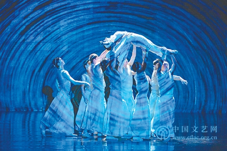 按中国古人“江河济淮”四渎之说,“河”特指“黄河” 。只是当你步入剧场,看到迷蒙的纱幕前放着两把高背靠椅;当你甫一坐定,看到靠椅上男三弦、女琵琶悠然弹唱,你立刻明白这“河”是“运河姑苏” ……似乎不用“开幕” (因为整个舞剧的述说就没有“幕”的开合) ,当评弹说唱者随着他们的座椅由“威亚”缓缓提升而去,扑面而来的就是一条波光粼粼、水流款款的河,如宽银幕3 D电影般贯通并覆盖着整个画面……当然,这是个可称为“裸眼3 D”的立体空间,在这个波光掩映、水流潺湲的空间中,影影绰绰地漂浮着一张宽大的床面。与这张绛红色床面一道漂浮的,还有一位悠悠忽忽、虚虚幻幻的女子……只要你有基本的观剧经验,就立马会实现一种认知意义上的“视觉转换” ——也就是说,眼前的视像并非说“一位女子和她的床”在“河”中漂浮,那个构成整体情境的“河”其实是这位女子躺在床上的心象;而那张与她如影相行的“床”反倒是这位女子的真实情境,她的真实情境就是在流露她的“梦境”……