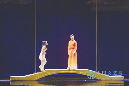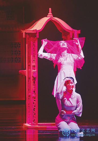 对于这个“失之交臂” ,茉娘心中的“他”似乎完全不曾留意,因此舞剧的叙事就成了茉娘近乎“单相思”的一种“执念” 。表现这种“执念” ,编导深知需要生动的细节,留在场刊上的两段话一是“闺房刺绣他的模样,红线在牵引” ;二是“花轿前的欲走还留,只因无处安放那颗春心” 。应该说,编导杨威就细节设置而言不仅在于合情合理,更在于找到了一种既具有“隐喻性”又具有“本体性”的舞蹈表现模态。比如那段“闺房刺绣他的模样……”的舞蹈,是“现在时”的茉娘与“过去时”的自己对视,更确切说是追忆自己曾经的纯情;而那一缕被长长牵引的嫣红绣线,其中隐喻的“憧憬”是不言而喻的。再比如那段“花轿前的欲走还留……”的舞段,那写意的“花轿”对茉娘而言犹如自由精神的“枷锁” ,所谓“无处安放的春心”即是她对“理想姻缘”的期盼!舞美设计刘科栋说自己“想建立一个‘水面上的牡丹亭’的雅致意象” 。他这话难道是暗示:杨威想通过“茉娘”传递的,是汤显祖写杜丽娘时的“一生儿爱好是天然” ? !