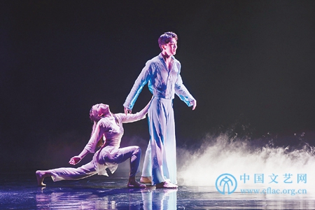 当茉娘从梦境的迷思成为清晰的追忆,她融入到一队青春袭人的少女之中……当这队少女从上场门后区沿前向对角线款款行来,你怎能不感受到“运河姑苏”的青翠欲滴、清风拂面、清冽可人……编导本意是想凸显茉娘心中的那束“光” ,那个“他” ,但却深知那“光”的价值取决于觅光者的品质,观众随着茉娘的袭人青春看到了更为青春袭人的“他” ……虽然只是擦肩而过,却仿佛曾经同衾而眠,让茉娘怦然心动、猝然情迷——这大概就是明代大才子汤显祖所言“不知所起,一往而深”之“至情” 。也的确,有波光流水的铺垫,有茉娘梦境的念想,再有少女青春的氤氲弥漫……那个极不易塑造的“他”塑造得极为不同凡响——有几分书生意气,有几分羁旅风霜,有几分侠肝义胆,有几分古道热肠……当编导杨威一再希望观众和自己一起去感受茉娘“对生命的渴望”之时,我当然相信她也是把“渴望”视为生命的原动力!