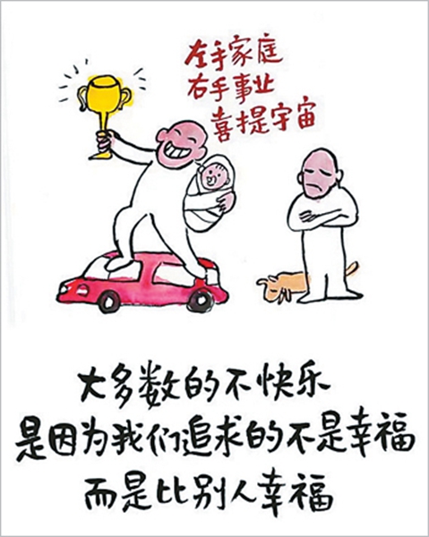 ● “老树画画”答:你说得很对,网络是个无边的世界,人们在其中自由地表达,涌现出无数非凡的头脑和精彩的想法。我出过一本书《在江湖》,我说的这个“江湖”其实就是指的网络。网络上各种各样的事件和精彩的段子给我很大的触动和启发。早期画的很多画,其实就是在画这些段子,比如“人生就像打电话,不是你先挂,就是他先挂”。网络让这些画作更现实、准确、有趣、有感染力。