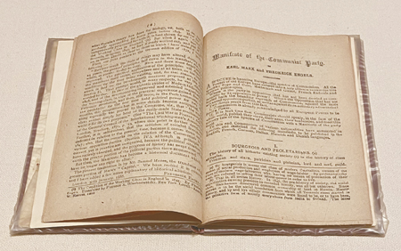 《共产主义原理》采用的也是问答形式,共25个问题,大部分问题是在《共产主义信条草案》基础上做相应修改与补充。从展出的1955年出版的《共产主义原理》可以看到,书中的问题变成了“什么是共产主义?”“什么是无产阶级?”“是不是说,无产者不是一向就有的?”“无产阶级是怎样产生的?”等。到《共产党宣言》,马克思、恩格斯抛弃了这种“教义问答”文体,改用“宣言”体,更注重科学性、革命性、战斗性和实践性,直接点明共产党人的科学观点。