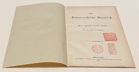 此本为德文版早期版本,恩格斯于1883年6月28日为此版作序。由李一氓先生捐赠,是国家图书馆现藏最早的德文版《共产党宣言》。