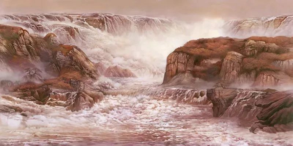《中流砥柱》以屹立在黄河急流中的砥柱山为主体,喻示党史百年如奔流不息、勇往直前的母亲河,中国共产党带领人民在中华民族伟大复兴历史征程中立潮头、勇担当发挥中流砥柱的作用。
