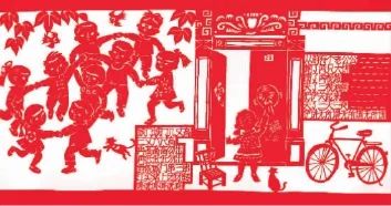 大道至“剪”,“剪”生万物。民间艺人可以凭借一张纸和一把剪刀,就能创作出精妙绝伦、包罗万象的剪纸艺术。剪纸融入民俗事象,承载着民间生活的情感和记忆。石库门建筑是老上海城市的标识,是上海城市文化的摇篮,石库门内哺育了一代又一代的上海市民,石库门的弄堂,更是孩子们的天堂。昔日上海的孩子们就在这种嬉闹中一天天长大,弄堂文化既满足了孩子们天真的童性,也激发了他们的创造才能。弄堂里各种小贩的叫卖声,总有一些调皮的孩子学着样子,和着调子一起唱,这就是他们的学堂,唱出弄堂里那一片悦耳的歌谣……