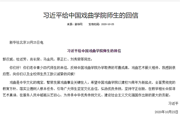 习近平总书记2020年10月23日给郭汉城、杜近芳、尚长荣、马金凤、蔡正仁、刘秀荣等中国戏曲学院师生回信,对他们传承发展好戏曲艺术提出殷切期望。
