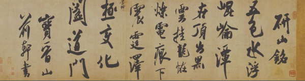 宋室南渡后,书坛仍以保存及延续北宋书法为旨。故此,高宗推重并收藏米芾书作,本卷正是佳证。骑缝钤“内府书印”,为宋高宗的鉴藏玺印,印的篆文风格与钤盖位置均同高宗收藏的其他书作吻合。后黄绢隔水亦有南宋权相贾似道藏印,可推断此卷是从皇室中流出。明末清初文献著录有《研山铭》传本多件,本件原作则一直秘藏不录,直至近代辗转流落日本。国家文物局于2002年成功竞购此作,后由故宫博物院收藏。此次为《研山铭》首度于境外展出。