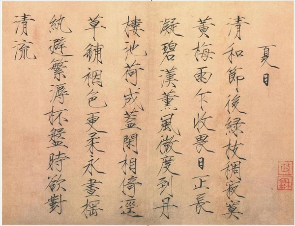 《夏日诗帖》是书于政和年间,经典瘦金名帖代表作,流传九百余年,至今保存完好。古人评论瘦金体云:“横画收笔带钩,竖画收笔带点,撇如匕首,捺如切刀,竖钩细长而内敛,连笔飞动而干脆”,是对瘦金书特色的高度概括。又有赞云:瘦金书“金镂之妙,细比毫发,殆与神工鬼能,较奇逞并于秋毫间。”对瘦金体书法的高度艺术成就推崇备至。上述特点在此贴中可谓体现的淋漓尽致,毫无遗憾可言。