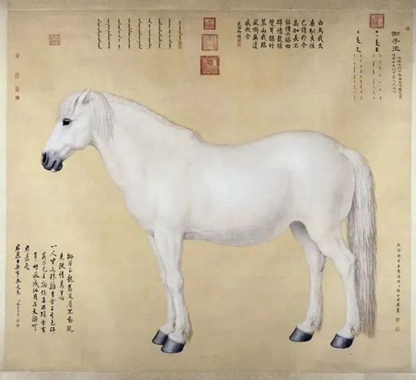 此马名“狮子玉”,是藏传佛教格鲁派活佛进献的贡品,由耶稣会教士画家郎世宁绘制。作品的画法上采用了西方绘画的透视法,有光影的呈现和写实的记录,连马的血管也画了出来,但这幅画却是用水墨创作的,乾隆还为这幅画题跋。