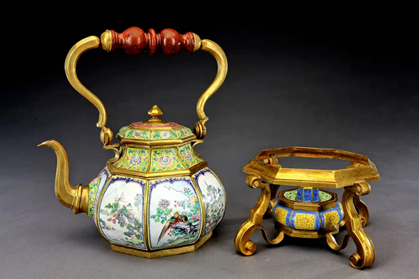 清 乾隆款画珐琅八棱开光山水花鸟图提梁壶 绸平金绣 故宫博物院藏