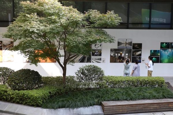 策展团队在博物馆一层中庭内将部分以自然、动物为题材的纪录类组照置于其中,与中庭内的绿植相映成趣。展馆外墙作框,远观如生态丰富的自然风景照;走近观瞧,在交织的树影间,画面中的大熊猫、兔狲等动物活灵活现,如同让人置身于生态园中。临海市民李女士在暑期带着上小学的孩子到场观展,特意在中庭内拍照打卡,她说能看到这么高水准的摄影展览十分难得,带孩子感受下艺术氛围,也是让她认识世界的一种方式。
