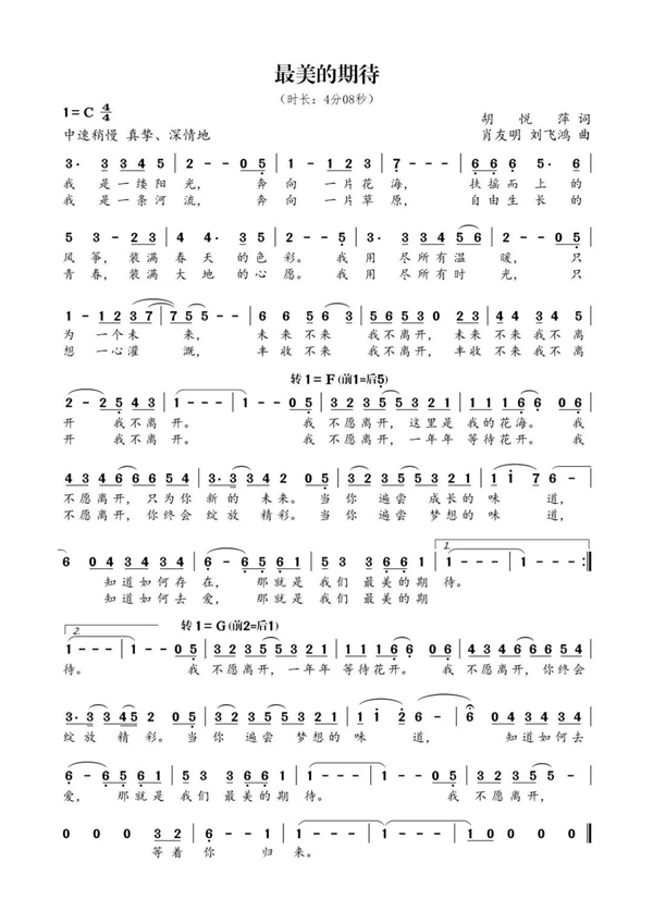 《最美的期待》用“我”“学校”“你”“大地”集中体现了教师、学校、学生、家长这四个主要角色,全曲围绕这几个角色之间紧密的关系而创作。这首歌是对教师的真情告白,旋律流畅、感情质朴、充沛。