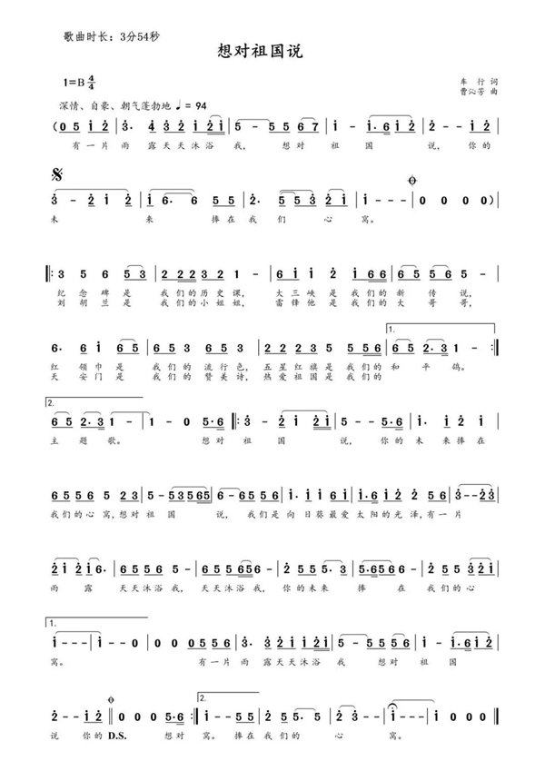 《想对祖国说》采用了抒情和激情相结合的笔调,将优美动人的旋律与朴实真挚的歌词巧妙结合起来,旋律采用明亮的大调式,整首曲调积极向上、朝气蓬勃,又蕴含满腔的热情与深情,唱出了对祖国的无限热爱。