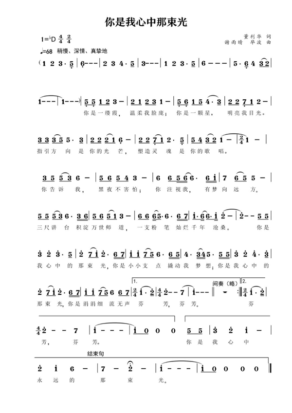 《你是我心中那束光》是一首赞美教师的歌曲,旋律真挚、亲切。叶圣陶先生说过:“教师就是捧着一颗心来,不带半根草去的。”从古到今,每一个成功的人都离不开教师的循循善诱。该歌曲旨在致敬教育战线上每一位默默守护、耕耘、无私奉献的教育人,正是因为无私奉献,世界才会如此精彩。