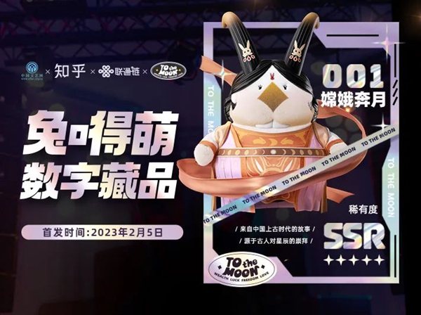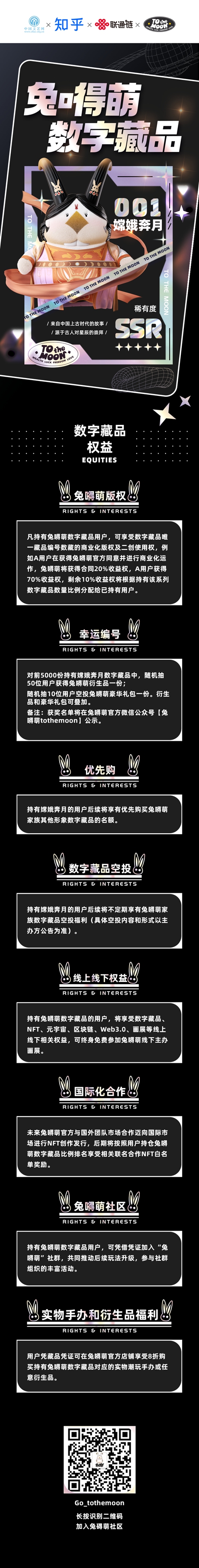 该藏品为兔嘚萌家族首款形象,嫦娥奔月来自中国上古时代的故事,源于古人对星辰的崇拜,外观设计将兔子形象和中国风完美结合。