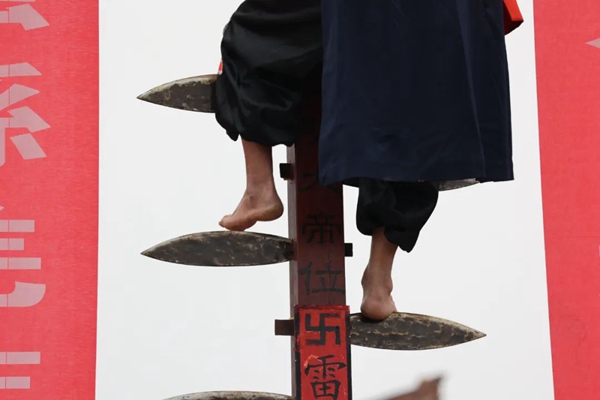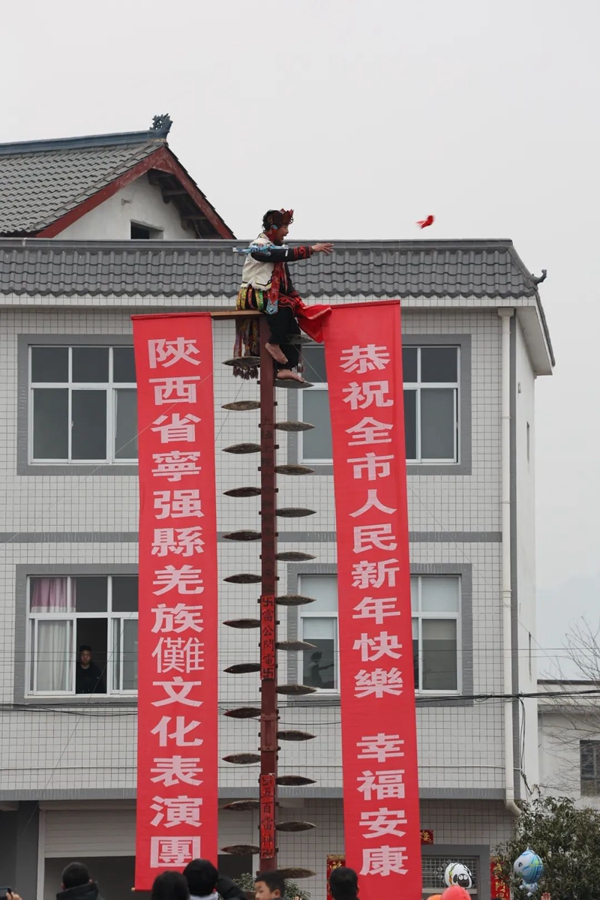 陕西省汉中市南郑区协税镇元宵节活动开幕式羌族民俗“上刀山”表演