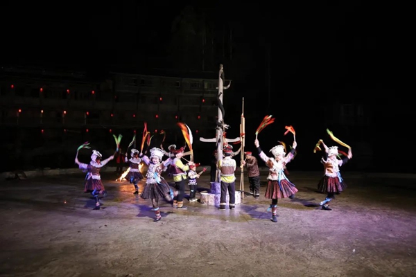 广西柳州市融水苗族自治县香粉乡雨卜村的民俗活动展演之吹芦笙、跳踩堂舞