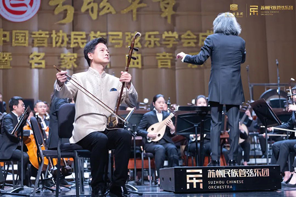 4月25日,“弓弦华章——中国音协民族弓弦乐学会成立暨名家名曲音乐会”在江苏省苏州市苏州民族管弦乐团音乐厅精彩上演。图为民族弓弦乐齐奏《我爱你中国》。