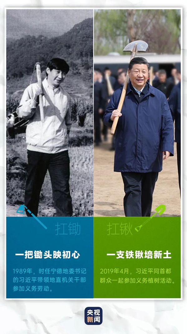 1989年,任宁德地委书记时,习近平带领地直机关干部参加义务劳动。30年后,2019年,总书记参加首都义务植树。