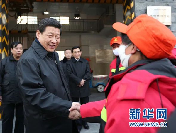 2013年2月8日,习近平总书记来到地铁施工现场、派出所、环卫站、出租客运公司,看望慰问坚守岗位的一线劳动者。这是习近平在西城区环境卫生服务中心手帕口清洁站看望一线环卫工人并与他们亲切握手。新华社记者刘卫兵 摄
